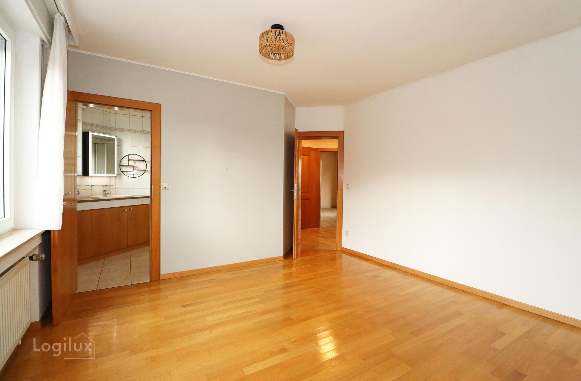 Rez-de-chaussée : hall d'entrée, WC séparé, débarras, salon, cuisine équipée séparée avec balcon, chambre à coucher avec salle de douche attenante, chambre/bureau