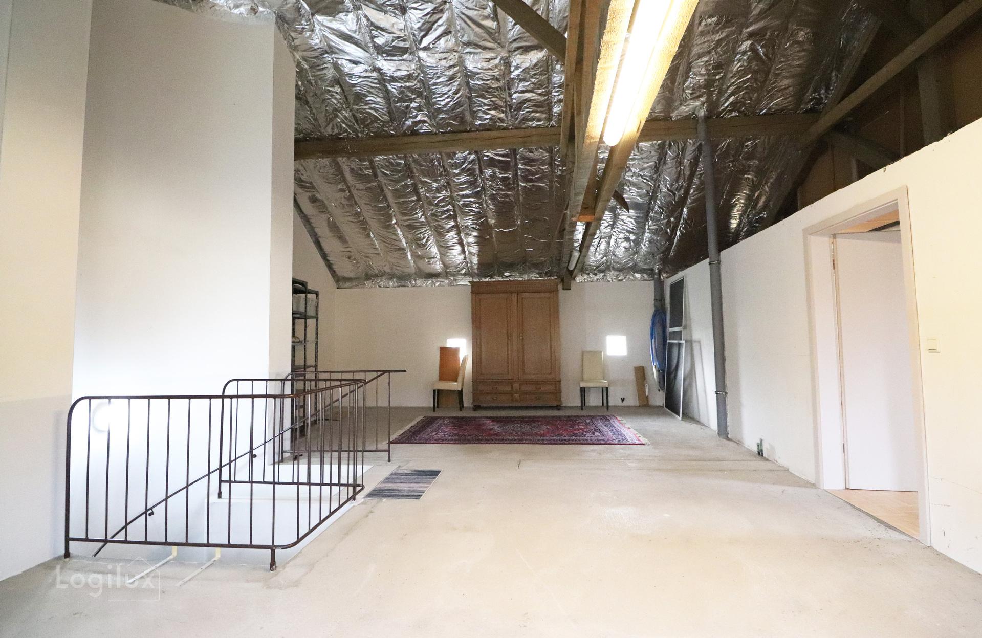 Combles aménageables : raccordement électrique, eau et chauffage disponibles. Actuellement divisés en deux pièces pour un total de 88 m². Plusieurs aménagements sont possibles
