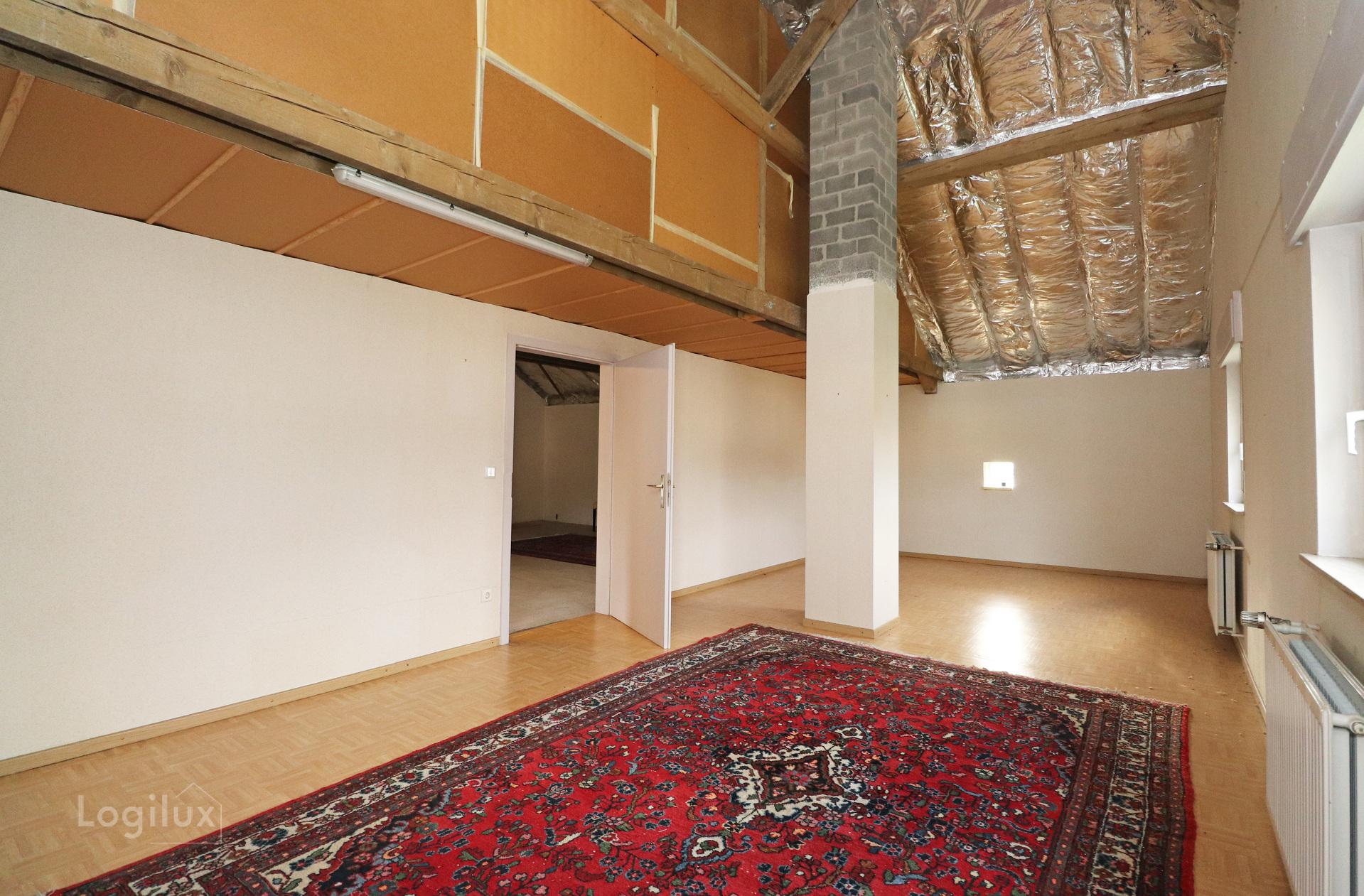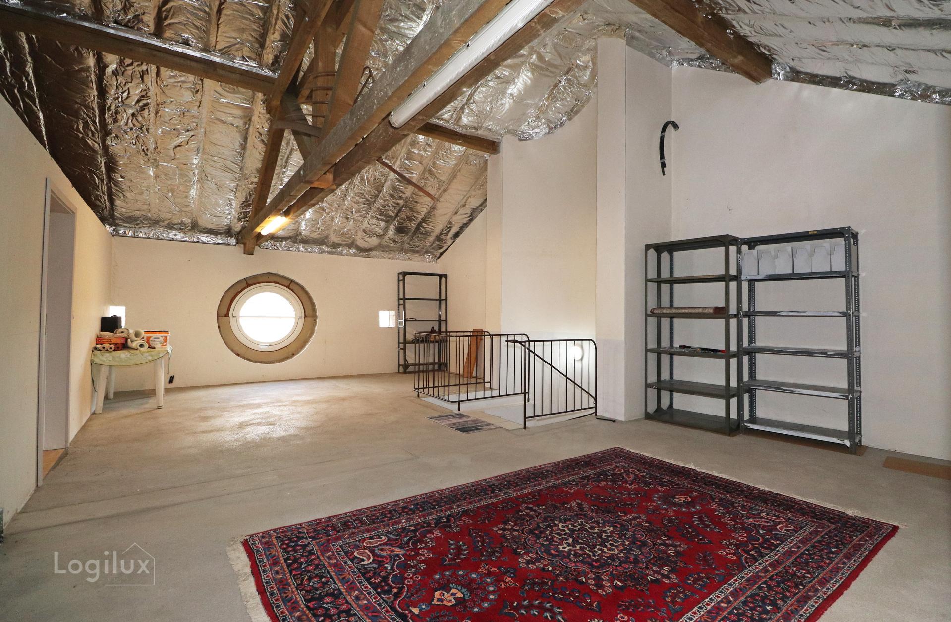 Combles aménageables : raccordement électrique, eau et chauffage disponibles. Actuellement divisés en deux pièces pour un total de 88 m². Plusieurs aménagements sont possibles